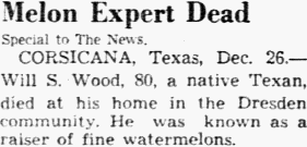 CORSICANA, Texas, Dec. 26 - Will S. Wood, 80, a native Texan, died at his home in the Dresden community. He was known as a raiser of fine watermelons.