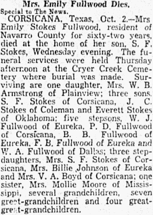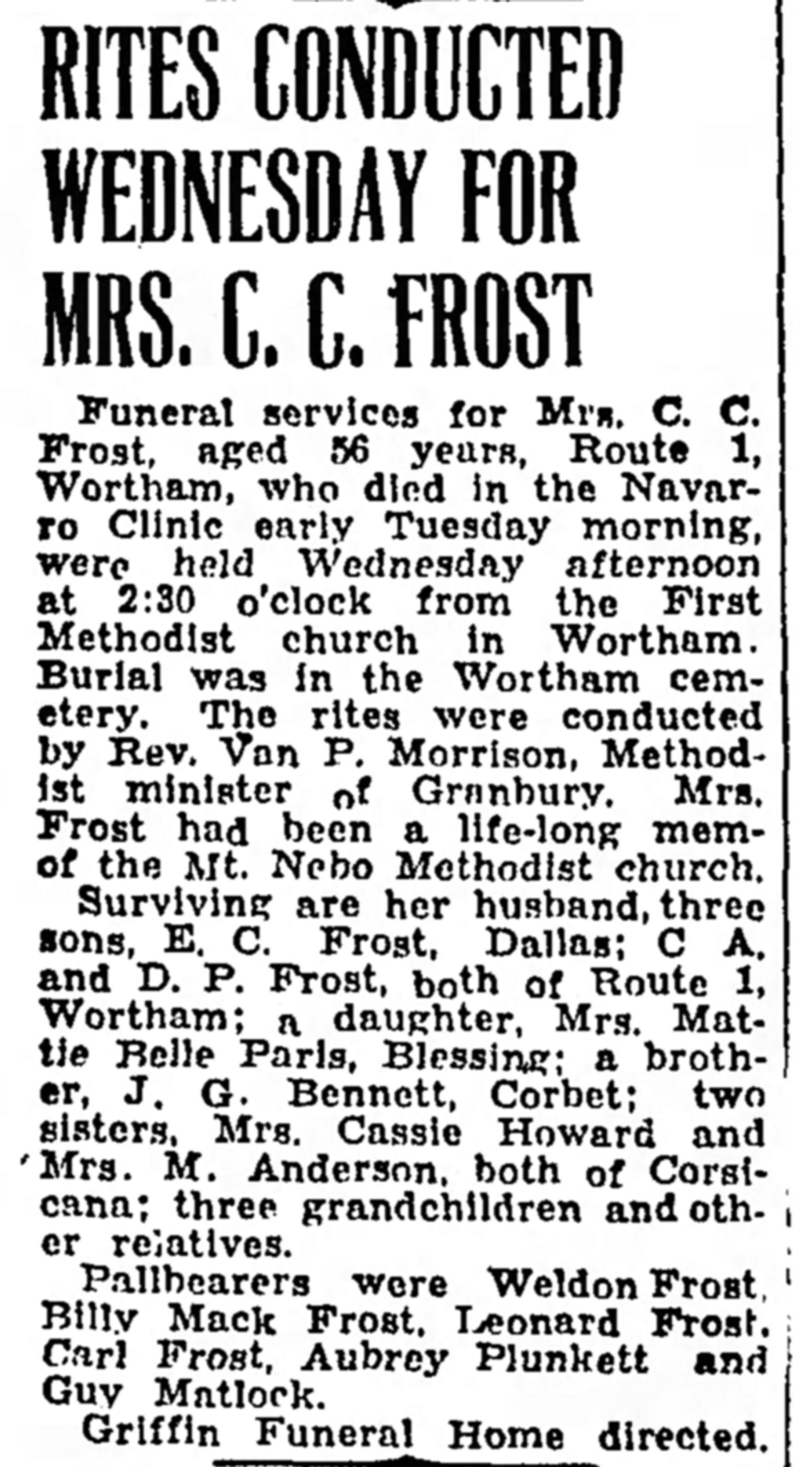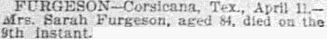 Funeral services for Mrs. Susie Golden, 67, who died at her home here were held with the Rev. G. W. Kornegay, pastor of the Eleventh Avenue Methodist Church, officiating. Burial was made in Oakwood Cemetery. She had been a resident of Corsicana for thirty-eight years. She is survived by three daughters, Mrs. Ida Caton and Mrs. Maggie Clarkston of Corsicana and Mrs. Mattie Mae Joiner of Mexia.