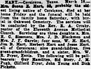 - Corsicana, Texas. March 18. - Mrs. Susan E. Hart, 83, probably the