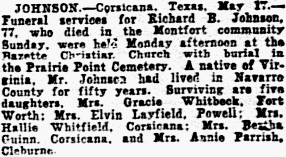 May 21, 1934 LIVINGSTON. - Corsicana, Texas. May 21. - Funeral services for James H. Livingston, 65, lifelong resident of Navarro County, who died at his home in the Richland community early Sunday, were held Monday afternoon with burial in the Richland Cemetery. The rites were conducted by the Rev. Jimmie Langston of Wortham. Surviving are his wife; a son, W. E. Livingston of Richland; and a sister, Mrs. J. A. Johnston of Dallas. Notes: