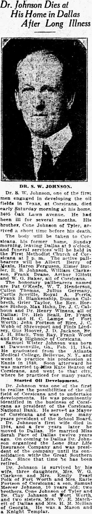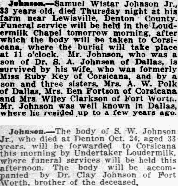 JOHNSON - Corsicana, Texas, Nov. 7. - B. W. Johnson, aged 74 years, of Wortham, who has been under treatment at the Physicians and Surgeons' Hospital here for some time, died there yesterday, and the body was sent to Wortham from burial. He is survived by his wife and four grown children. Notes: