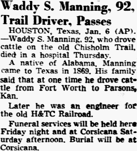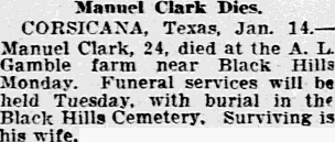 CORSICANA, Texas, Jan. 14. - Manuel Clark, 24, died at the A. L. Gamble farm near Black Hills Monday. Funeral services will be held Tuesday, with burial in the Black Hills Cemetery. Surviving are his wife.