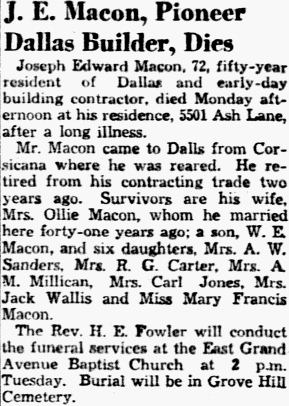 Mr. Macon came to Dallas from Corsicana where he was reared. He retired from his contracting trade two years ago. Survivors are his wife, Mrs.Ollie Macon, whom he married here forty-one years ago; a son, W. E. Macon, and six daughters, Mrs. A. W. Sanders, Mrs. R. G. Carter, Mrs. A. M. Millican, Mrs. Carl Jones, Mrs. Jack Wallis and Miss Mary Francis Macon.