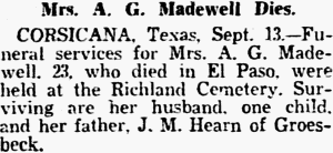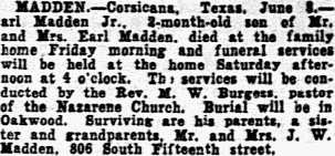 MADDEN - Corsicana, Texas. June 8. - Earl Madden Jr., 3-month-old son of Mr. and Mrs. Earl Madden, died at the family home Friday morning and funeral services will be held at the home Saturday afternoon at 4 o'clock. The services will be conducted by the Rev. M. W. Burgess, pastor of the Nazarene Church. Burial will be in Oakwood. Surviving are his parents, a sister and grandparents, Mr. and Mrs. J. W. Madden 806 South Fifteenth street.
