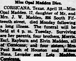 CORSICANA, Texas, April 18. - Miss Opal Madden, 17, daughter of Mr. and Mrs. J. W. Madden, 806 South Fifteenth street, died Monday following a long illness. The funeral will be held at 4 p. m. Tuesday. Surviving are her parents, four brothers, Morris, Earl, Rayburn and Elvin Madden, all of Corsicana; and four sisters, Mrs. Paul Rash of Houston and Misses Nona, Lavador and Lois Madden, Corsicana.