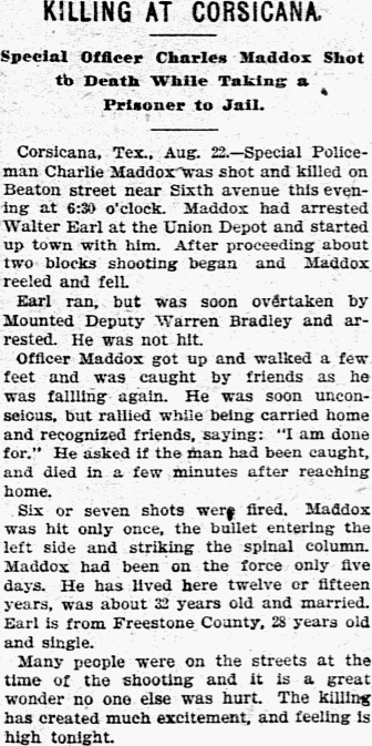 Corsicana, Tex., Aug. 22. - Special Policeman Charlie Maddox was shot and killed on Beaton street near Sixth avenue this evening at 6:30 o'clock. Maddox had arrested Walter Earl at the Union Depot and started up town with him. After proceeding about two blocks shooting began and Maddox reeled and fell.
