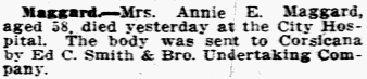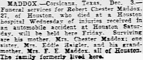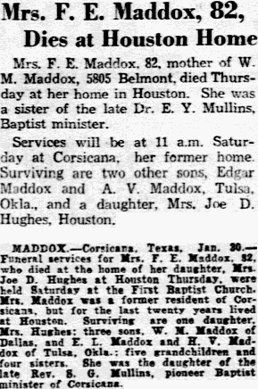 MADDOX - Corsicana, Texas. Jan. 30. - Funeral services for Mrs. F. E. Maddox, 82, who died at the home of her daughter, Mrs. Joe D. Hughes at Houston Thursday, were held Saturday at the First Baptist Church. Mrs. Maddox was a former resident of Corsicana, but for the last twenty years lived at Houston. Surviving are one daughter, Mrs. Hughes; three sons, W. M. Maddox of Dallas, and E. L.