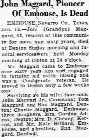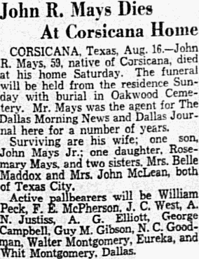CORSICANA, Texas, Aug. 16 - John R. Mays, 59, native of Corsicana, died at his home Saturday. The funeral will be held from the residence Sunday with burial in Oakwood Cemetery. Mr. Mays was the agent of The Dallas Morning News and Dallas Journal here for a number of years.