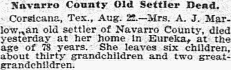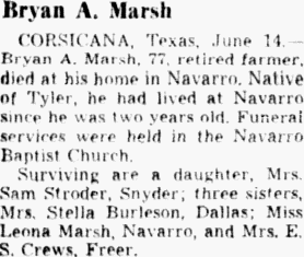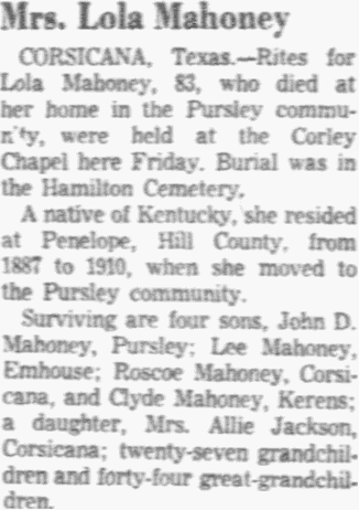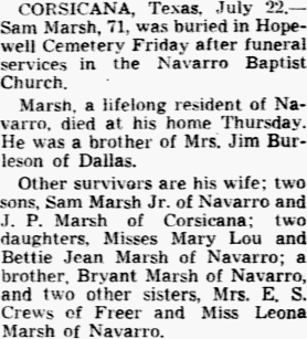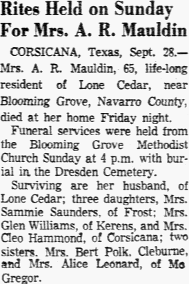 husband, of Lone Cedar; three daughters, Mrs. Sammie Saunders, of Frost; Mrs. Glen Williams, of Kerens, and Mrs. Cleo Hammond, of Corsicana; two sisters, Mrs. Bert Polk, Cleburne, and Mrs. Alice Leonard, of McGregor.