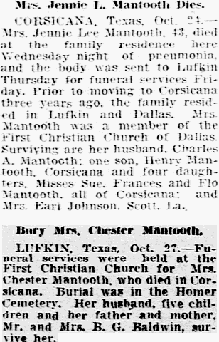 Maddox and H. V. Maddox of Tulsa, Okla.; five grandchildren and four sisters. She was the daughter of the late Rev. S. G. Mullins, pioneer Baptist minister of Corsicana.