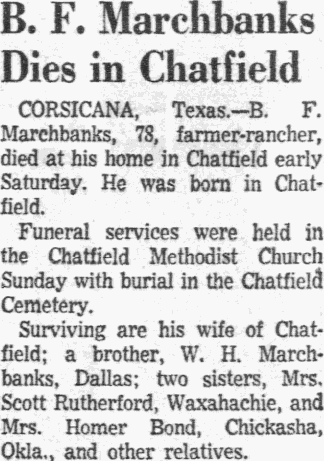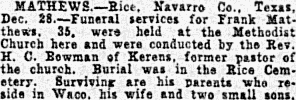 Funeral services for W. F. Hodge, 81, of Rice, were held at Haynie Memorial Methodist Church at Rice at 4 p.m. Monday, followed by burial in Rice Cemetery. Officiating ministers were the Rev. Connally Dugger Jr. of Rice and the Rev. Lively Brown of Ennis. Pallbearers were Floyd Baggs of Oklahoma City, Jake Oliver of Dallas, Tony Vallot of Grand Prairie, Lynn Blount of Amarillo, Garth Hodge of Ennis and Charles Tyler of Irving. Mr. Hodge was born May 6, 1884 in Chatfield, Tex. He was married to Miss Myrtle Bell of Rice Aug. 31, 1910. Mr. Hodge was a retired merchant of Rice and a member of the Rice First Methodist Church. Survivors include his wife, two sons, Jack W. Hodge, Richardson, and W. G. Hodge, Ennis, three daughters, Miss Frankie Hodge, Rice; Mrs. J. L. Oliver, Dallas, and Mrs. F. T. Blount, Amarillo, ten grandchildren; 3 great-grandchildren; four sisters, Mrs. C. A. Nowlin, Ennis; Mrs. Mary Boucher, Hunnington Beach, Calif.; Mrs. Lyle Swafford, Abilene; Mrs. Ed. McCants, Houston. |
