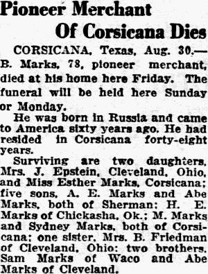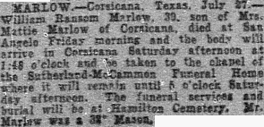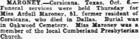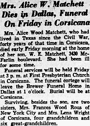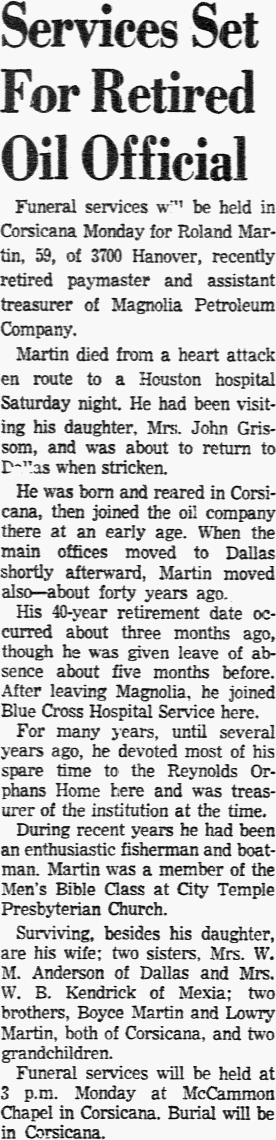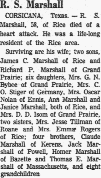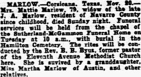 a.m., Marrs-Mundy-Quill Funeral Home, 3000 Maple Ave., R-5121, Rev. John R. Rice officiating. Remains will go overland to Corsicana, Texas. Services there at 1:30 p.m.