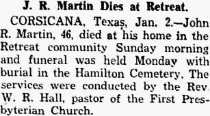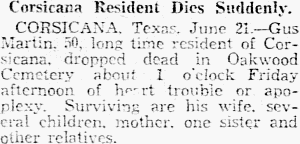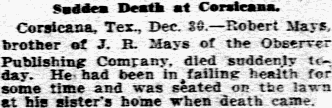 Corsicana, Tex., Dec. 30 - Robert Mays, brother of J. R. Mays of the Observer Publishing Company, died suddenly today. He had been in failing health for some time and was seated on the lawn at his sister's home when death came.