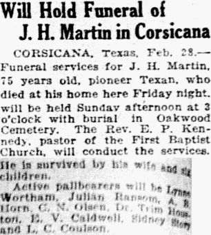 to Corsicana for burial by Mr. and Mrs. Hughes, Mrs. Henry Johnson, Mrs.