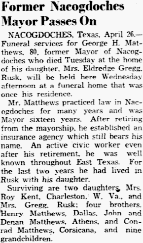 Active pallbearers will be William Peck, F. E. McPherson, J. C. West, A. N. Justiss, A. G. Elliott, George Campbell, Guy M. Gibson, N. C. Goodman, Walter Montgomery, Eureka, and Whit Montgomery, Dallas.