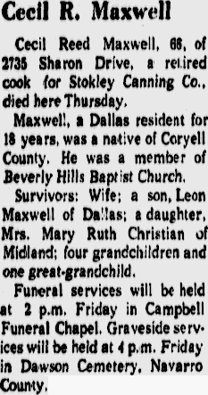 Survivors: Wife; a son, Leon Maxwell of Dallas; a daughter, Mrs. Mary Ruth Christian of Midland; four grandchildren and one great-grandchild.