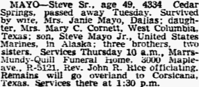 Survived by wife, Mrs. Janie Mayo, Dallas; daughter, Mrs. Mary C. Cornett, West Columbia, Texas; son, Steve Mayo Jr., United States Marines, in Alaska; three brothers, two sisters. Services Thursday 10