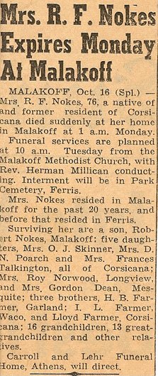 Surviving her are a son, Robert Nokes, Malakoff; five daughters, Mrs. O.