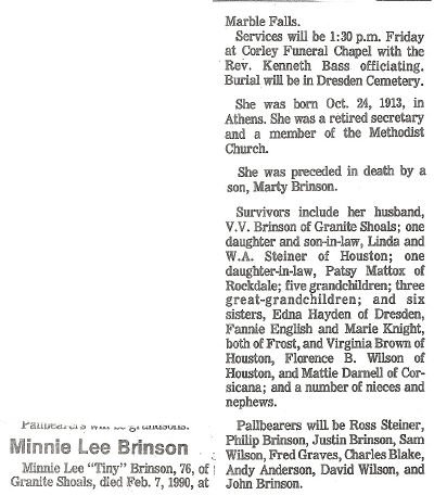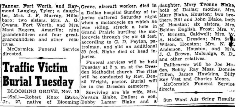 Corsicana, and an aunt, Mrs. Ella Noble, Kerens.