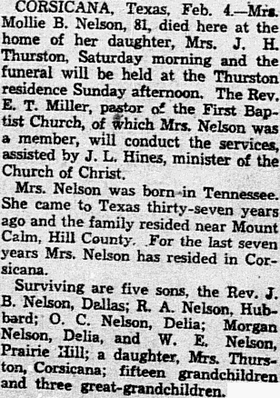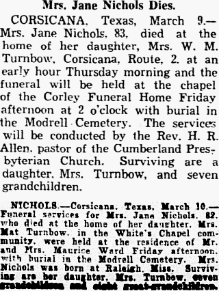 March 9, 1933 Mrs. Jane Nichols Dies CORSICANA,