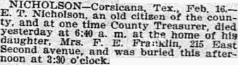 - Corsicana, Tex., Feb. 16. - E. T. Nicholson, an old citizen of the