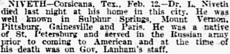 - Corsicana, Tex., Feb. 12. - L. Niveth died last night at his home in