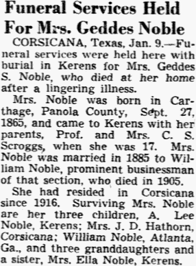 January 9, 1942 Funeral Services Held For Mrs. Geddes Noble CORSICANA,