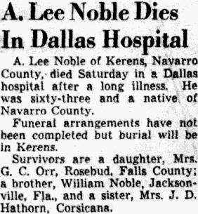 Lee Noble of Kerens, Navarro County, died Saturday in a Dallas hospital