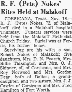 Nov. 16, 1951 RR. F. (Pete) Nokes' Rites Held at Malakoff CORSICANA,