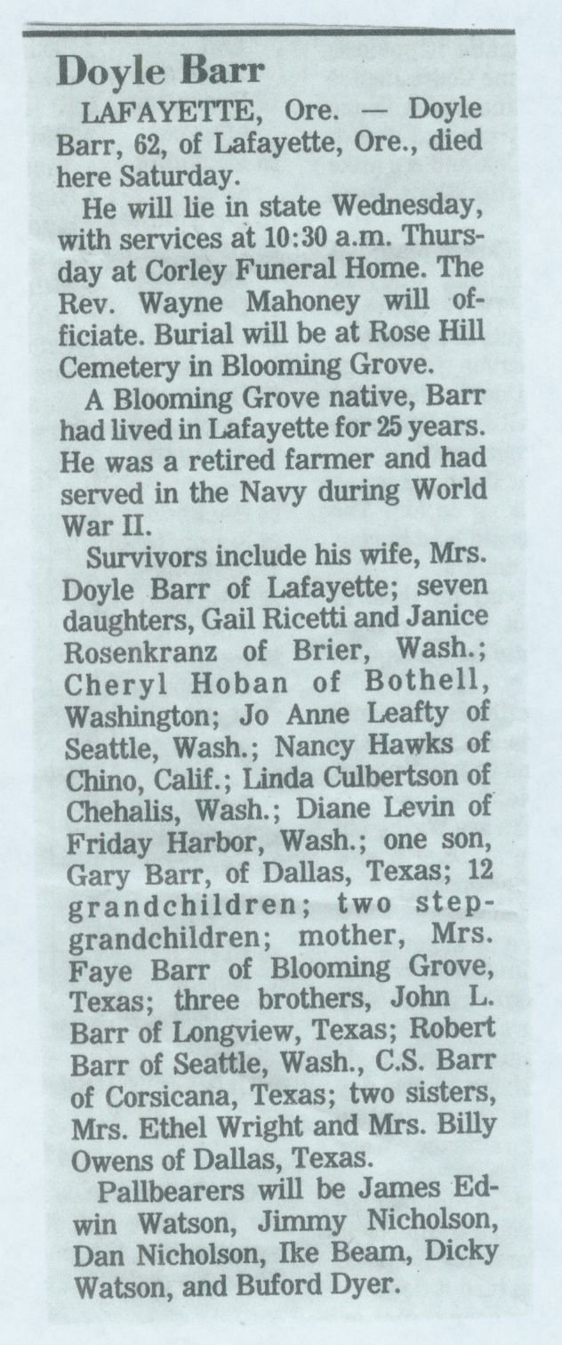 Son-Douglas Chapman of Corsicana, TX Daughter-in-Law-Janet Chapman of Corsicana, TX Grandson & Wife-Robert & Crystal Owens of Corsicana, TX
