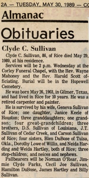 Feb 15, 1921 - Oct 26, 1978 W. C. Dobbs KERENS - Funeral services were held Tuesday at 2 p.m. at Paschal Funeral Home for William Curry Dobbs, 56, who was killed in one-car accident Friday