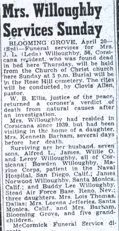 Mar 4, 1900 - Apr 19, 1956 Corsicanan Dies While Visiting At Blooming Grove BLOOMING GROVE, April 19 (Spl) - Mrs. J. L. (Leda) Willoughby, 56, Corsicana
