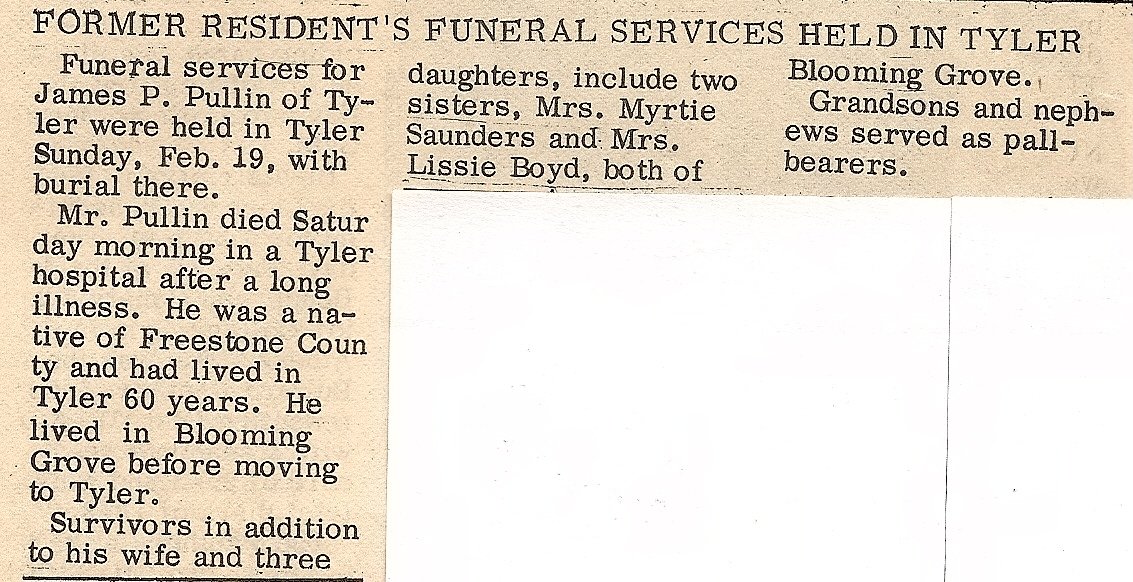 all of Blooming Grove; two daughters, Mrs. Dee Pullins, Prairie