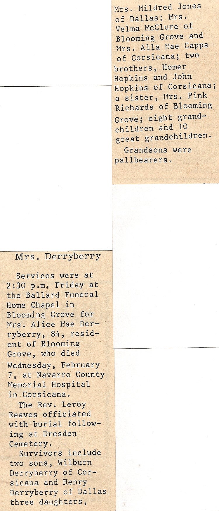 Survivors include two sons, Wilburn Derryberry of Corsicana and