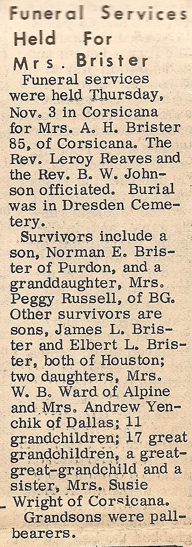 located in Navarro County toward Dresden with Dr. David Hale of Northside Baptist Church officiating.
