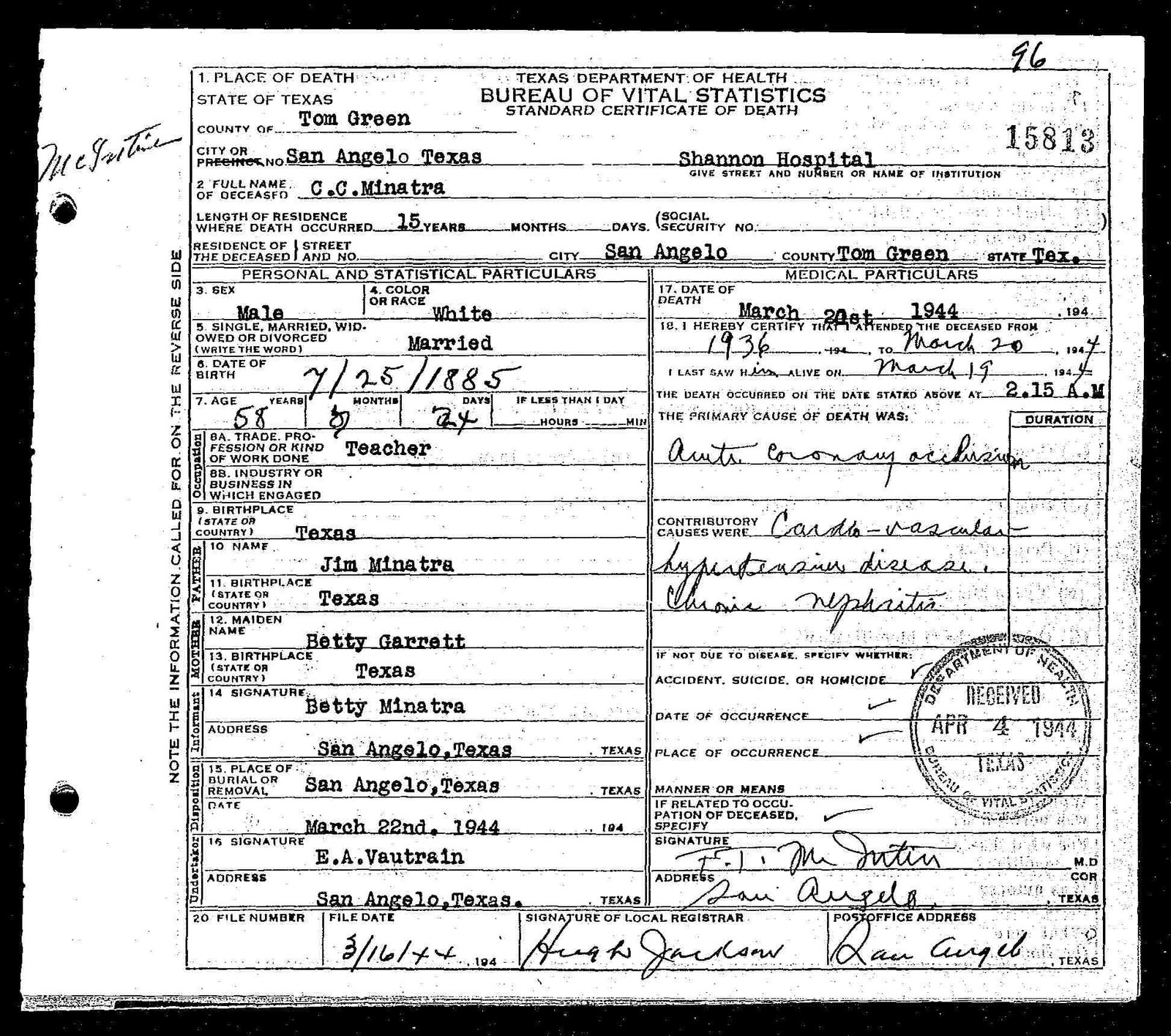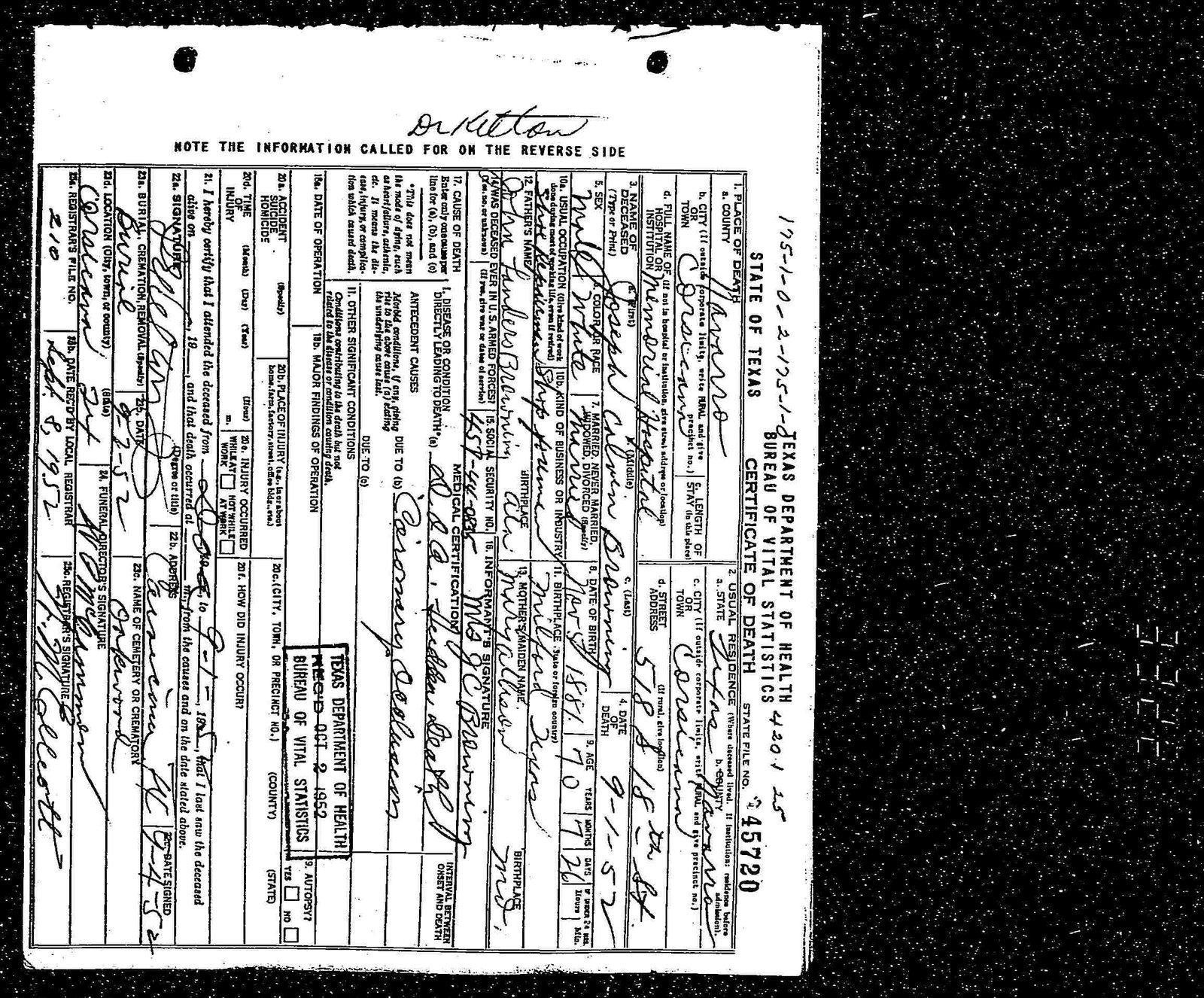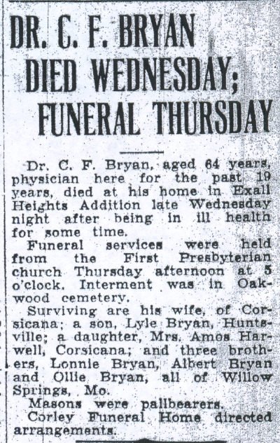 in Corsicana with the Rev. B.F. Risinger Jr. officiating and assisted by