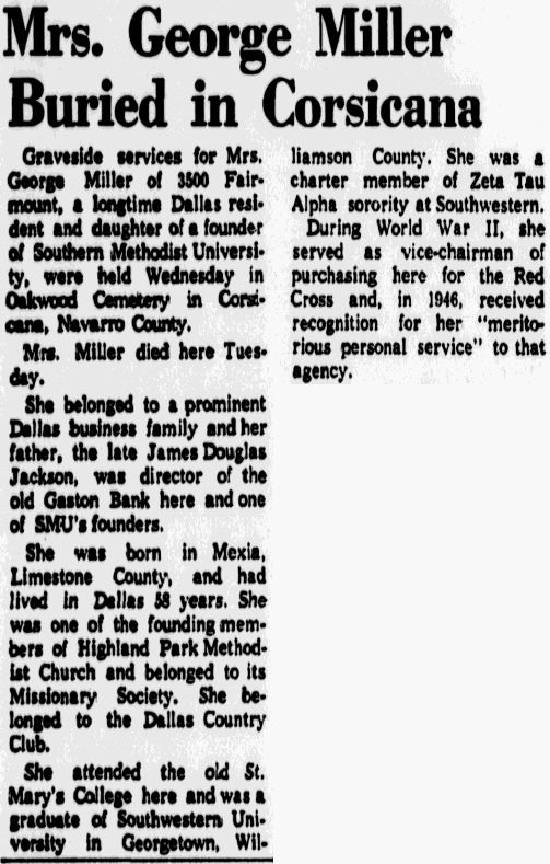 Lillian Jackson, age 87, passed away Wednesday, Jan. 6, 2010, in Corsicana. She was born June 9, 1922, in Emhouse to W.W. and Alma Ray. Mrs. Jackson is survived by a daughter, Linda Blatchley; grandson, Chris Blatchley; granddaughter, Jessica Alonzo and husband Michael; and two great-granddaughters, Vanessa Blatchley and Makayla Alonzo. Visitation will be held from 6 to 8 p.m. Friday, Jan. 8, at Corley Funeral Home. Services will be held at 10 a.m. Saturday, Jan. 9, at Corley Funeral Chapel with Kenny Farnham officiating. Interment will be at Pattison Cemetery in Emhouse. Arrangements by Corley Funeral Home.