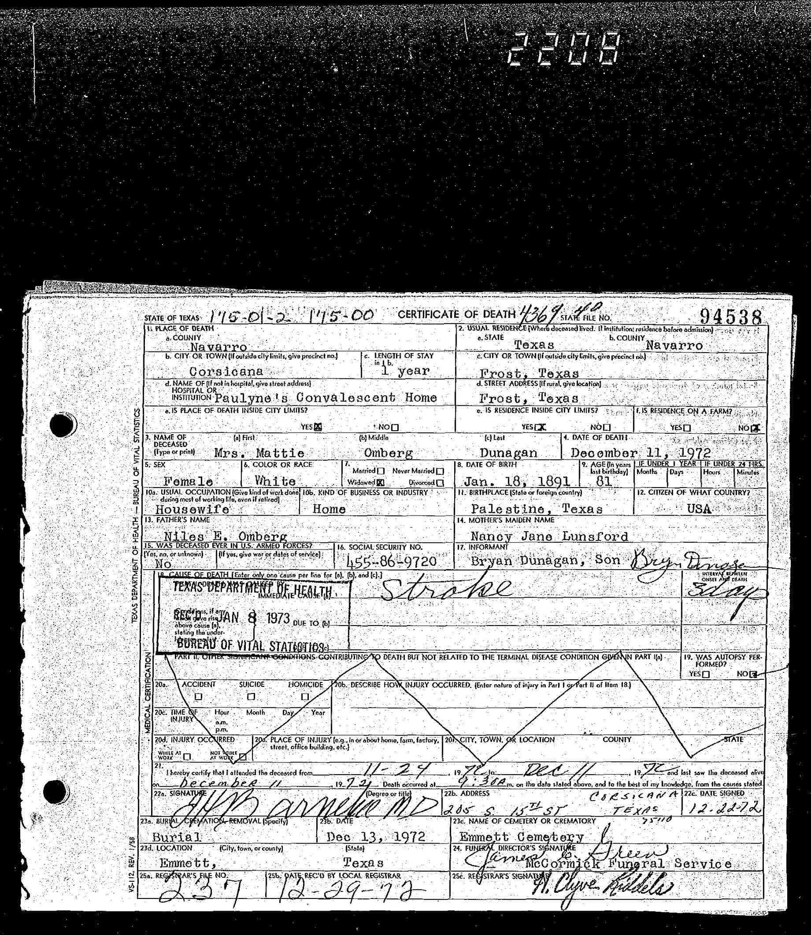 at Navarro Regional Hospital. She was born December 4, 1915 in Emhouse,