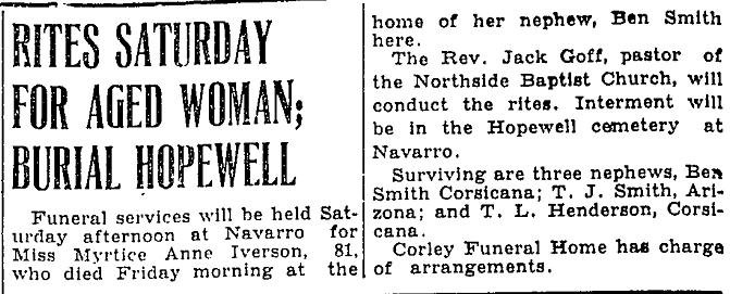 Mrs. Anna Peeples, 94, died in Blooming Grove, Texas, a few days ago. Survivors include a son, Aubrey Clark of Tipton, two daughters, three sisters and two brothers.