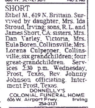 Survivors include her son, Lynn Short of Frost; a niece,