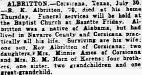 ALBRITTON - Corsicana, Texas, July 30, - B. K. Albritton, 70, died at his