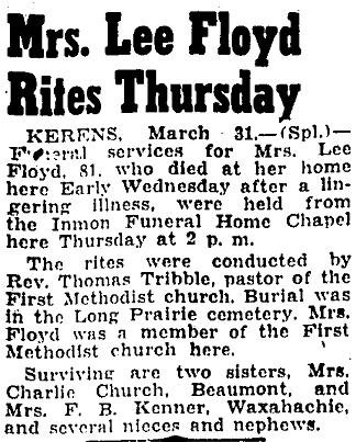 home Monday morning at 11 o'clock. Interment was in the Kerens cemetery.