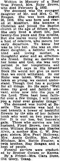 Rural Shade; and a twin brother, Ray Reagan, Kerens.