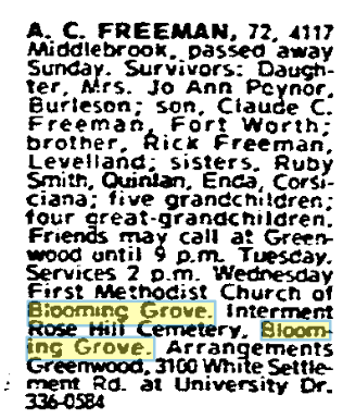 daughter, Mrs. James Pointer of Burleson; one brother, Rice Freeman