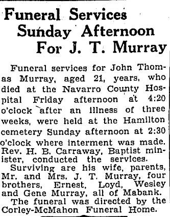 Nelson Murray of Mexia; one sister, Frances Shults of Purdon.