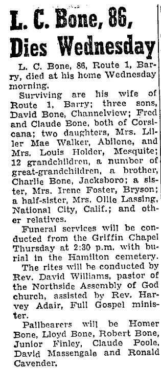 Louisiana; two sisters, Mary Elizabeth Banks, Corsicana, and Mrs.