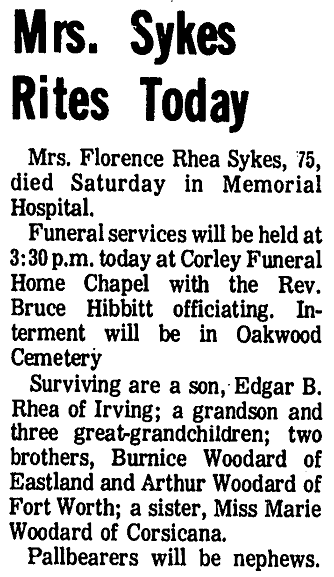 Morgantown, N.C.; two sisters, Mrs. Ben Crocker, Kerens, and Mrs. S.