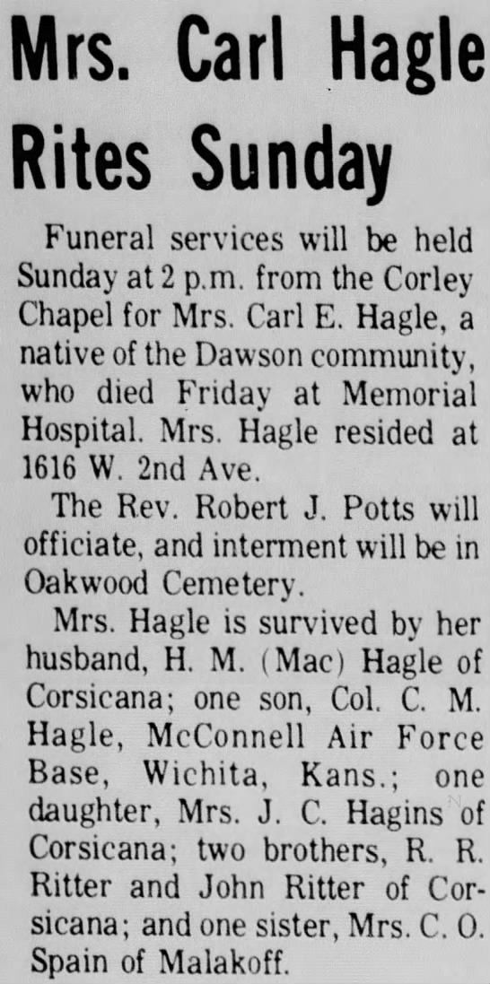 Corsicana many years, died at the family home, 1413 West Seventh and