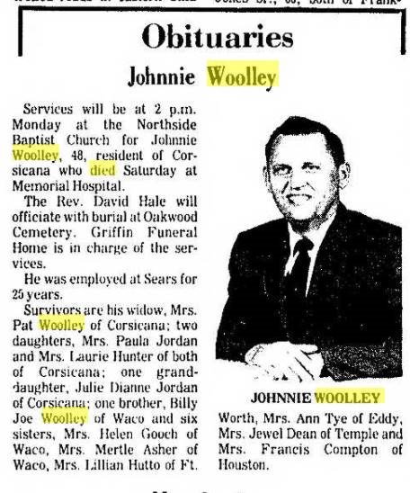Survivors are his widow, Mrs. Pat Woolley of Corsicana; two