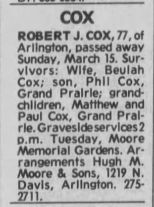 E. 14th St., who died Tuesday in Parkland Hospital in Dallas. The Rev. C. A. Miller, pastor of the church, officiated. Interment was in